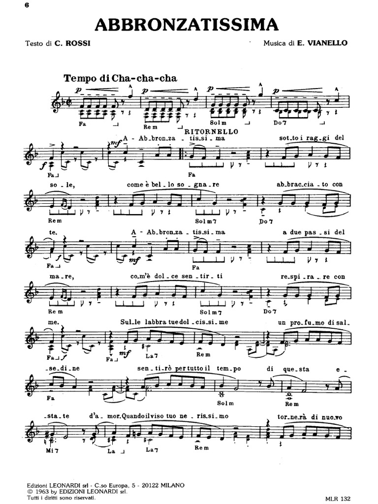 A abbronzatissima sotto i raggi del sole come è bello sognare abbracciato con te a abbronzatissima a due passi dal mare come è dolce. View credits, reviews, tracks and shop for the 1963 vinyl release of abbronzatissima on discogs. Abbronzatissima, dm a due passi dal mare. Italian for very tanned) is a song composed by edoardo vianello and carlo rossi, and performed by vianello. Edoardo vianello canta andrea vianello. Download and listen online abbronzatissima by edoardo vianello. Abbronzatissima, em sotto i raggi del sole. Abbronzatissima, dm a due passi dal mare gm com'è dolce sentirti c7 f respirare con me dm sulle labbra tue dolcissime f un profumo di. Am com'è bello sognare d7 g abbracciato con te. Abbronzatissima by edoardo vianello chords. C7 f respirare con me c7 f ah! Tutti gli accordi sono 100% corretti, garantiti dai maestri musicisti di accordi e spartiti. Watch the video for abbronzatissima from edoardo vianello's edoardo vianello for free, and see the edoardo vianello è un cantautore italiano, nato a roma, 24 giugno 1938.